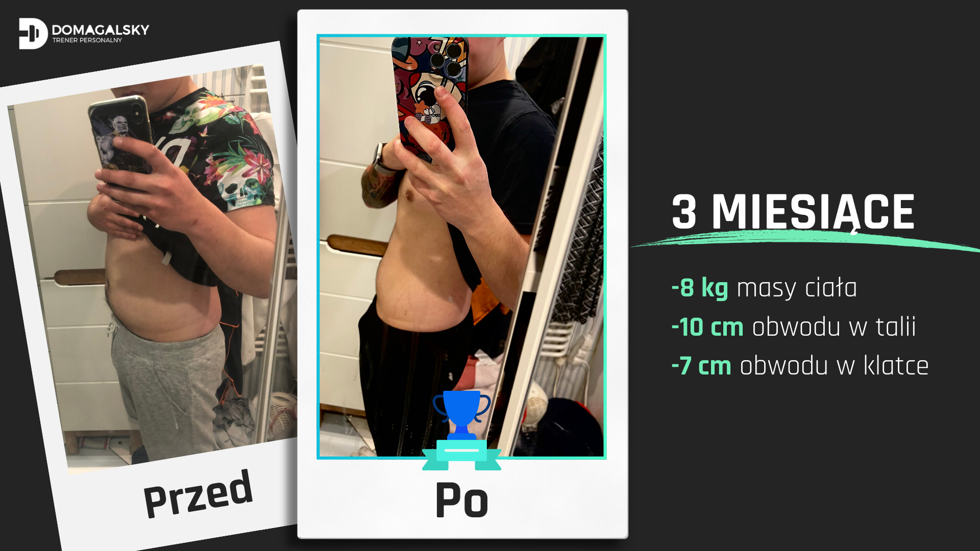 Efekty, jakie możesz osiągnąć, zależą od wielu czynników. Zazwyczaj widoczne rezultaty, takie jak poprawa kondycji, zmiana sylwetki czy wzrost siły, pojawiają się już po kilku tygodniach systematycznej pracy. Pamiętaj jednak, że trwałe i zdrowe zmiany wymagają czasu, wiedzy, którą zapewniam oraz Twojej konsekwencji.